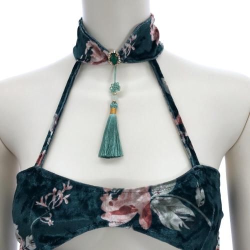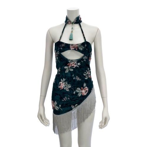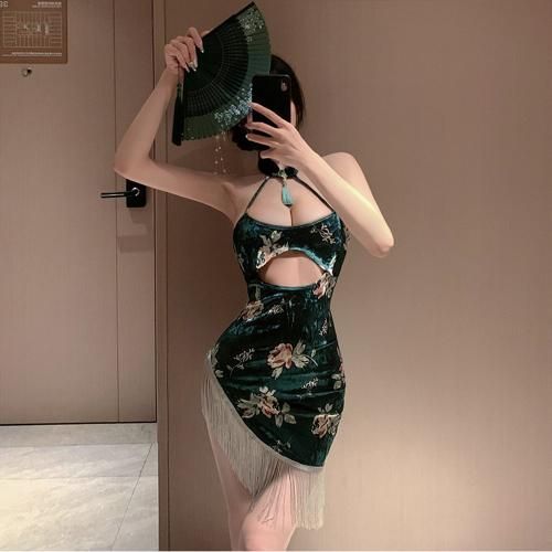 ミステリアスな世界へ誘うチャイナ服風コスプレ(COSPLAY)。クラシカルなベロア風の深いグリーンに薔薇の花が咲き、裾に施したフリンジが動くたびに揺れる姿は、不思議な世界へ誘なってくれそうなミステリアスなデザイン。カットアウトされたバストからは素肌がチラ見えし、斜めにカットされた裾からは太ももが露出。着用したままフリンジの揺れを眺めるのも楽しみの一つかも♪ネックはマジックテープ、ブラはホックで調整可能。