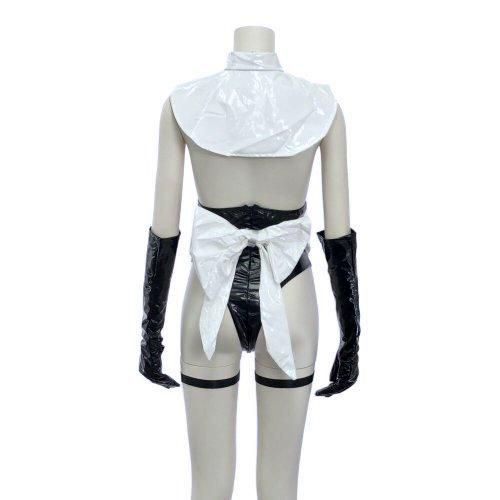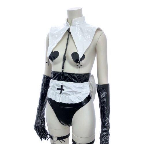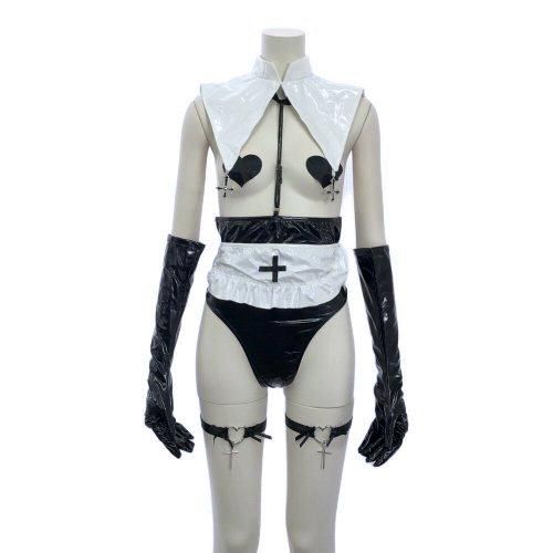 パテントレザーの光沢感と「見せる」ことで興奮させるシスター風コスプレ(COSPLAY)。PUレザーの光沢感にギリギリを攻めたハイレグテディがパートナーを惑わせる。首からテディに繋がるストリングがどこか拘束感があり、バストは二プレスで隠すだけの大胆デザイン☆後ろに大きなリボンが付いたエプロンやハートのガーターリングが、セクシーの中にもフェミニン要素があり艶っぽい。テディはファスナーで着脱可能です。