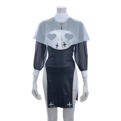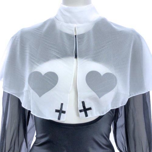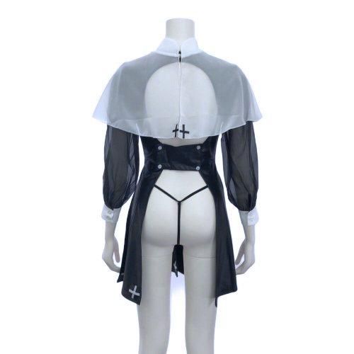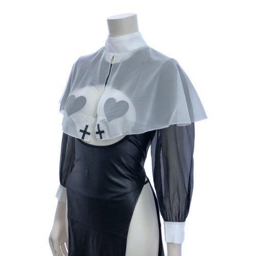 清らかさの中にある大胆な姿が魅惑的なシスター風コスプレ(COSPLAY) 。シフォンスリーブにシフォンのケープが清楚感を高めつつ、バストを大胆カットアウト。シフォンの向こう側にはハート型の二プレスが透けるワクワク感がたまらない♪ウエストまでの深いスリットで太ももを露わにし、スタイルアップしながら思いっきりセクシーに。背中側のマジックテープで調整可能です。