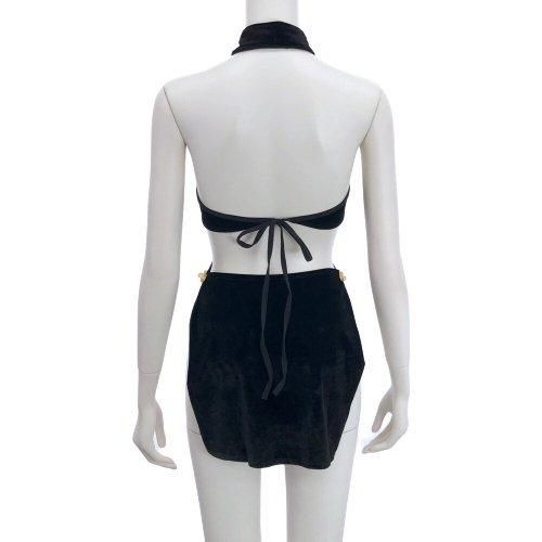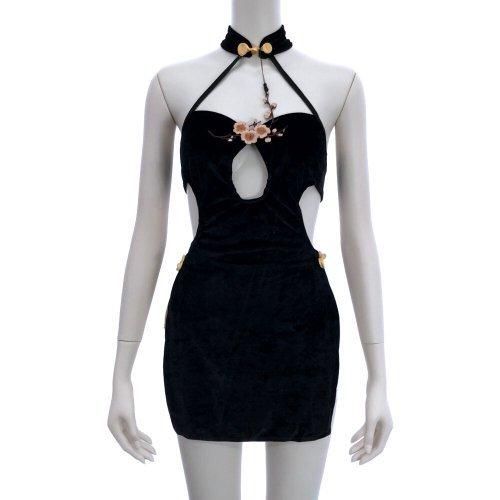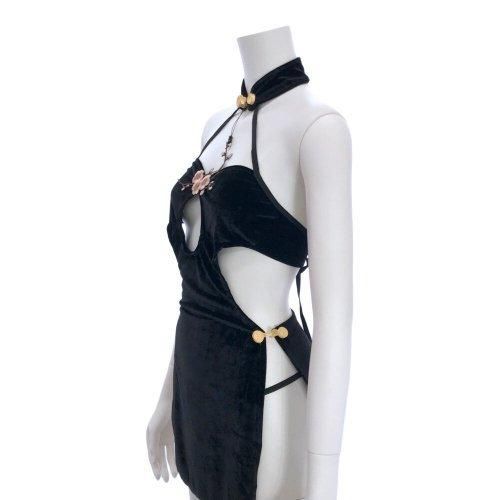 梅の花が胸元を彩るベロア素材のチャイナ服風コスプレ(COSPLAY)。黒のベロア生地に梅の花が咲いたクラシカルなスリットワンピは身体に沿うシルエットが妖艶で、バストをカットアウトすることで谷間がチラ見え。また、腰のチャイナボタンを外せば丸みを帯びたヒップがはらりと露出し、フェティシズムを刺激します。