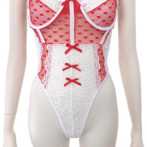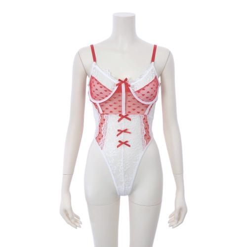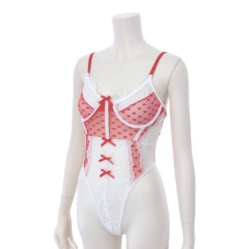 超ハイレグの透け素材が思い切り開放的な時間を生み出すナース風テディ(TEDDY)。赤いハート柄のチュールレースに小さな赤いリボン、白レースのコントラストがフェミニンで刺激的な超ハイレグテディ。腰深くから入ったハイレグは太ももを大胆に露出し、食い込んだヒップやスケスケのバックスタイルも必見です。裏地の入ったブラはワイヤーがバストを優しく持ち上げスタイルアップにも期待。セットのカチューシャを身に着けると一気にナースコスプレへ早変わり♪