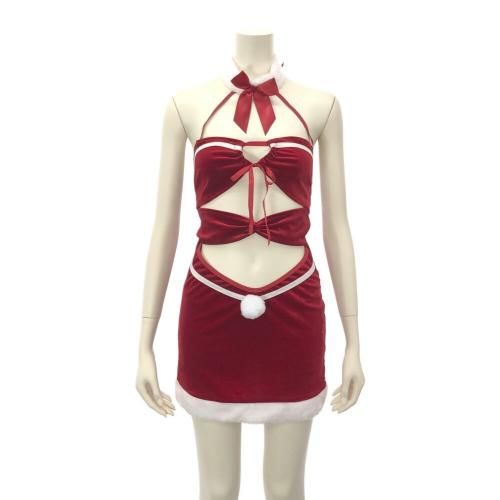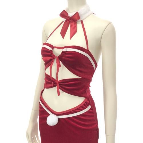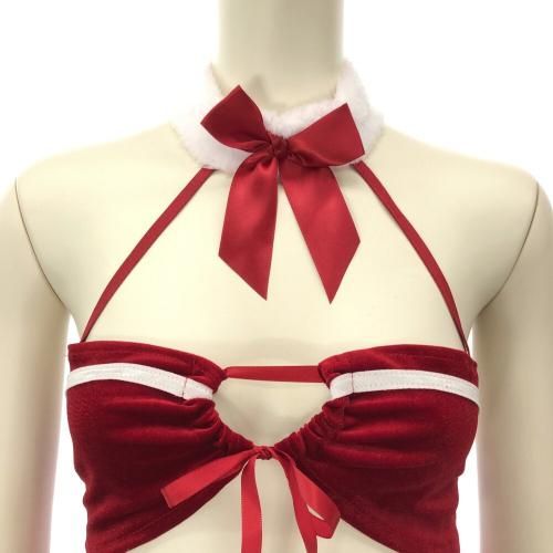 カットアウトから覗くおへそが可愛いサンタガール風コスプレ(COSPLAY)。モコモコチョーカー風の襟がフェミニンなデザインで、ボディコンのタイトなラインが女性らしい曲線美を描く人気のミニ丈ワンピース。カットアウトから覗く素肌に、バスト部分はリボンで結ばれただけのシンプルデザインで解いた瞬間の露わな姿にパートナーの期待も膨らみます♪