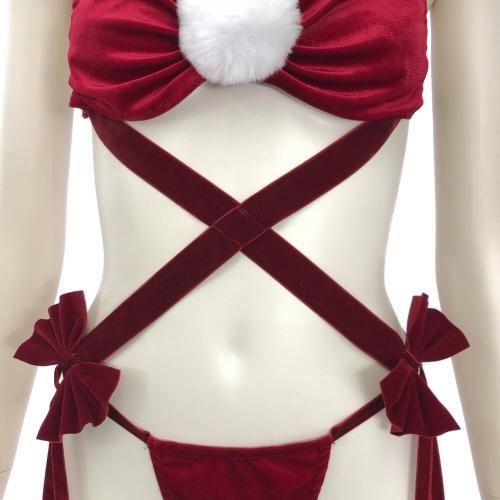 ポンポンが揺れストリングデザインがカラダを這うサンタガール風コスプレ(COSPLAY)。ベロア風の暖かみあるブラとショーツをストリングで繋げ、腰に施したリボンがフェミニンムード漂うセクシーなテディ。ショーツのポンポンが動くたびに揺れ、チョーカーの鈴が聖なる夜に鳴り響く♪バックスタイルはリボンで結んだだけのシンプルデザインで、ウエストのクロス部分は伸縮性あるゴムがカラダにフィットしストレスなく濃密時間を楽しめそう。
