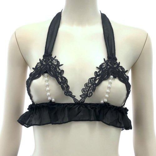 パールの手枷に刺激的な期待が膨らむブラ・ショーツセット(BRA・SHORTS SET)。美しいレースとチュールの華やかさに、バストトップとクロッチ部分をパールビーズで隠しただけのギャップが際立つ大胆なデザイン。クロッチには二連のパールがパートナーを迎え入れ、フェミニンなパールとリボンで繋がれた拘束感のある手枷は、手首にゴムを使用しているので肌を傷つけにくくちょっと刺激的なプレイを期待♪