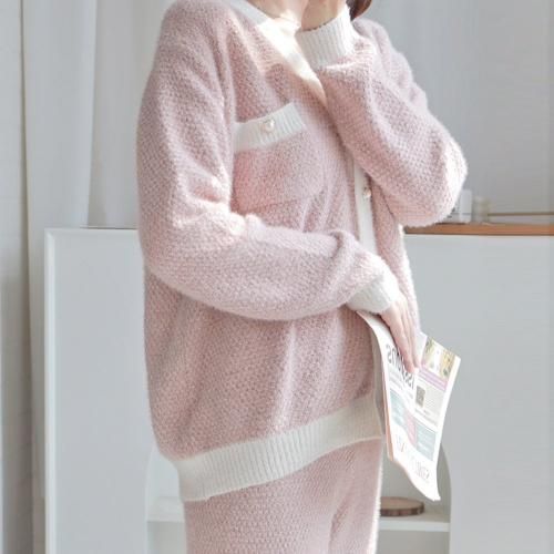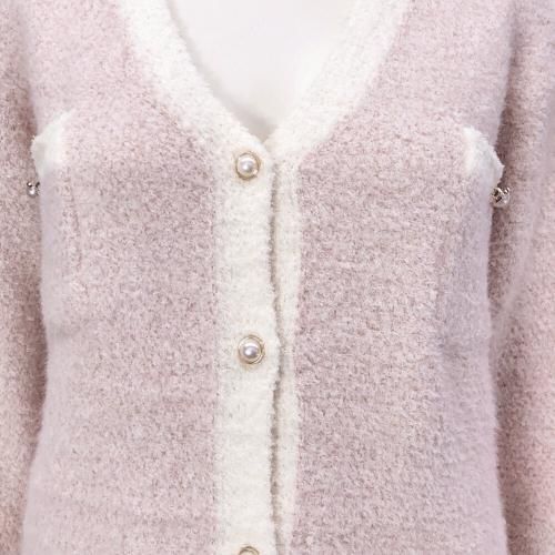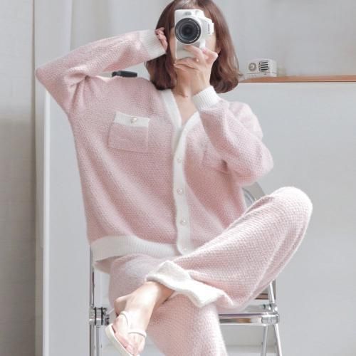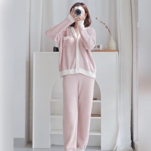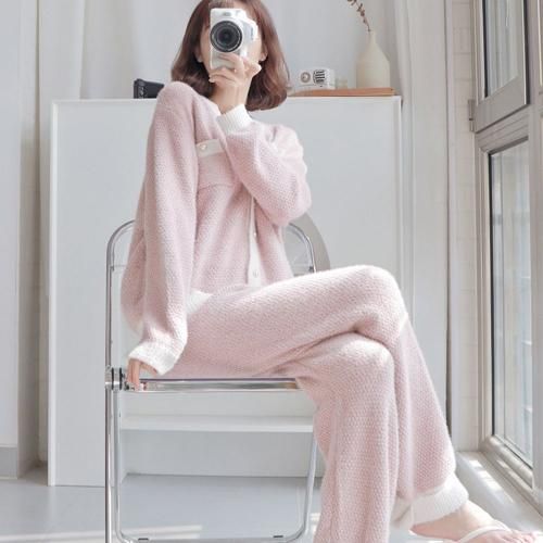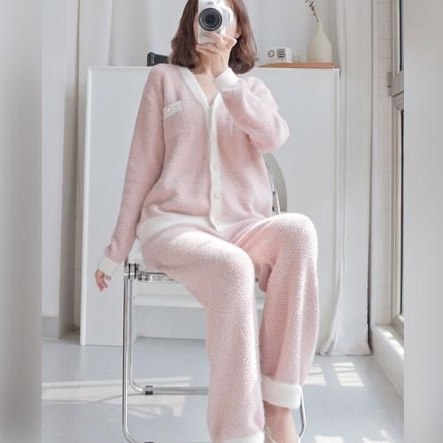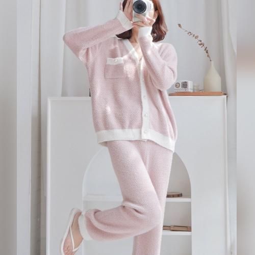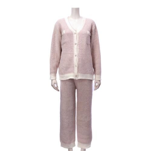 くすみカラーに金糸が大人っぽく垢抜けた印象のルームウェア(ROOMWEAR)。ベージュピンクの色合いが甘すぎず、パールボタンに金糸が編み込まれた大人な落ち着き感じるデザイン。ポコポコとした生地が空気を含み暖かさを逃がしにくく、快適なリラックスタイムを過ごせます。小さな小物が入るほどのポケット付きで、カーデガン単体としてデイリー使いにもおすすめです。