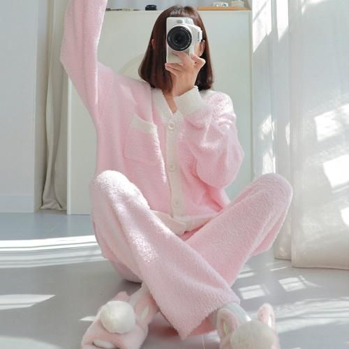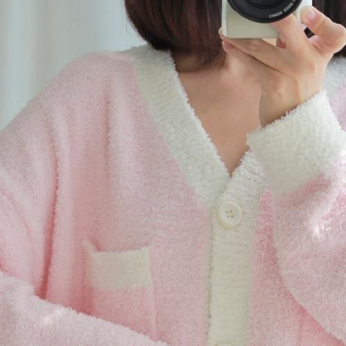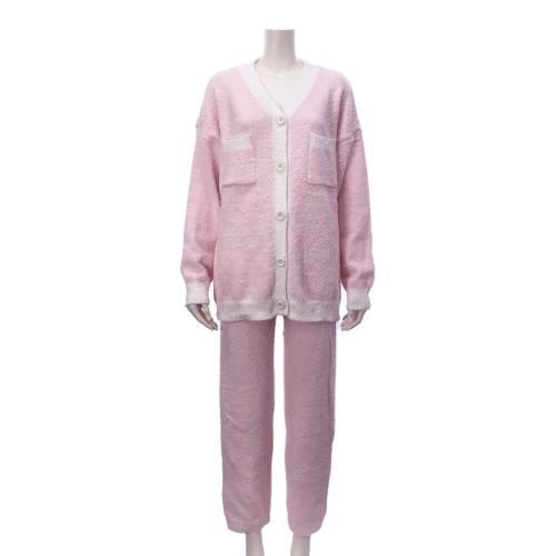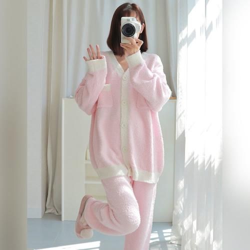 いちごミルクのようなカラーが甘酸っぱくフェミニンなルームウェア(ROOMWEAR)。パステルピンク×白のカラーリングがフェミニンで、長めのカーデはヒップまでの長さであたたかく快適なリラックスタイムを過ごせます。胸元にはちょっとした小物を入れるのにちょうどいいポケット付きで、足首の締め付けが少ないストレートパンツがストレスフリーなデザイン。ふんわりながらボリュームが抑えられているのでごわごわせずロングシーズン着用いただけます。