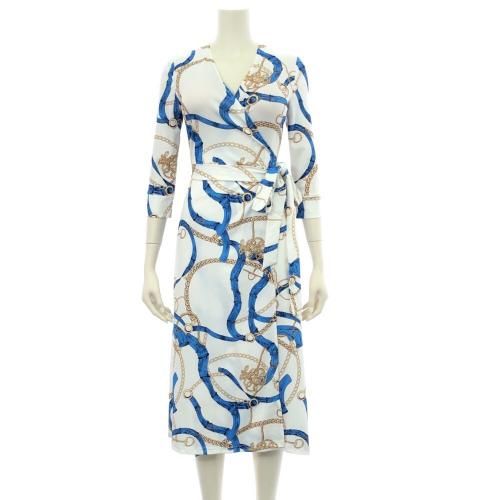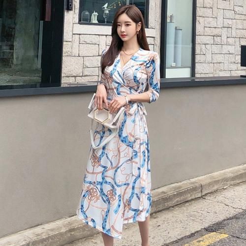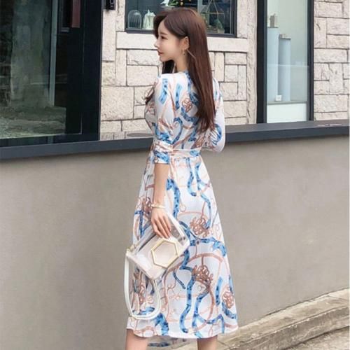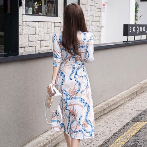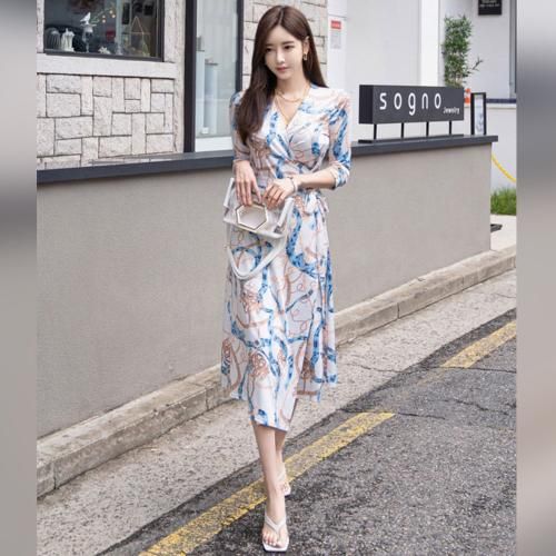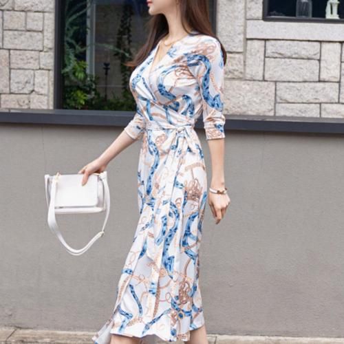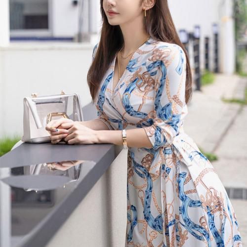チェーン柄ラップフレアワンピース(キャバドレス・CABARETDRESS)。サラッとした着心地にチェーン柄のすっきりとした七分袖がモダンなデザイン。リボンをウエストで交差するラップスカートはエフォートレスで気品漂い、コンパクトにまとまった胸元のシルエットとロングフレアが落ち着きある女性の印象を与えます。