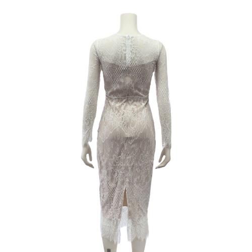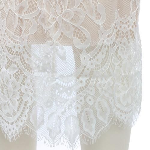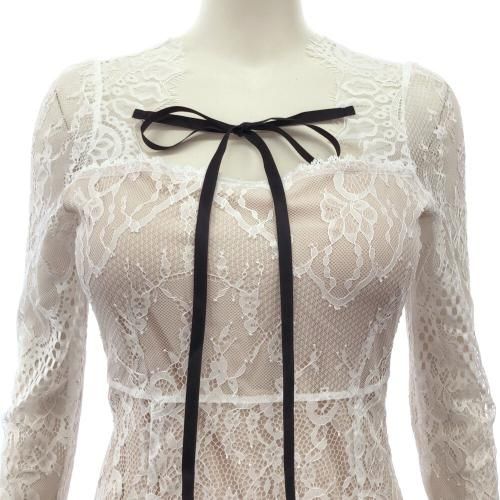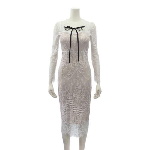 デコルテリボンペンシルラインレースワンピース(キャバドレス・CABARETDRESS)。ベージュベースに動きのある白のアイラッシュレースと、シアースリーブの抜け感が華やかでエレガント。スクエアネックとハイウエストの切り替えがスタイルアップ効果に期待でき、全体的に柔らかな色合いにフロントリボンがメリハリを付けグッとシャープな印象に。ファーベストやジャケットなど、コーデの幅も広がります。