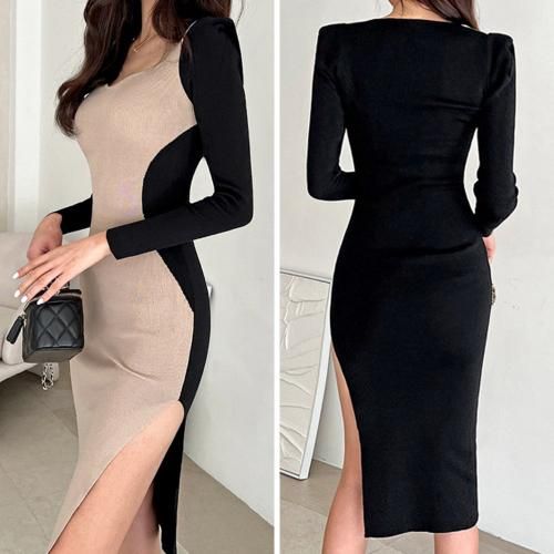 サイドスリットバイカラーニットワンピース(キャバドレス・CABARETDRESS)。フロントとバックで違う表情を見せるバイカラーがスタイリッシュな伸縮性のあるタイトなニットワンピース。ウエストの切り替えが女性らしい曲線を描き、深めのサイドスリットは太ももがチラ見えし脚長効果も期待♪ショルダーがシャープなシルエットの長袖は気になる二の腕もカバーしてくれます。