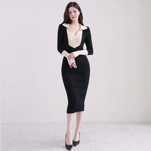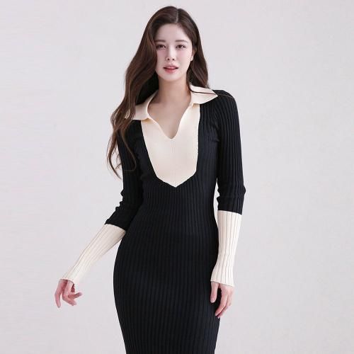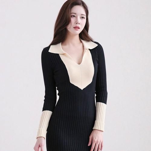 バイカラースキッパーニットワンピース(キャバドレス・CABARETDRESS)。伸縮性のあるリブ編みニットがボディラインにフィットし、スキッパーの切り替えが奥行きを与えお顔周りがシャープな印象に。インナーにスクエアキャミを合わせ露出を抑えたり、ざっくりスウェットトップスを上から重ね着することでカジュアルダウンなど、タイトだからこそ着回ししやすいデザインワンピです。