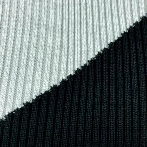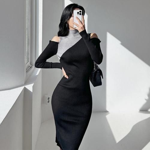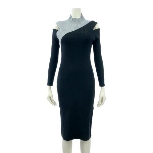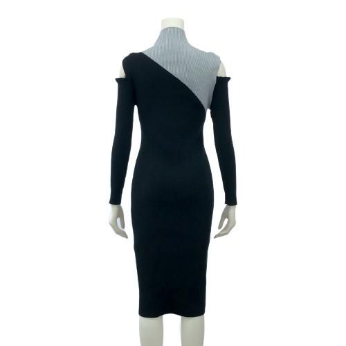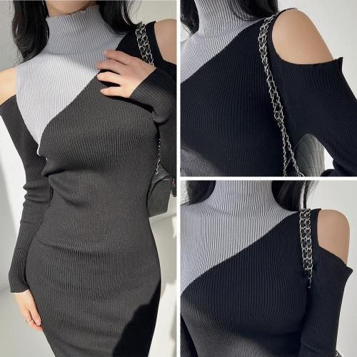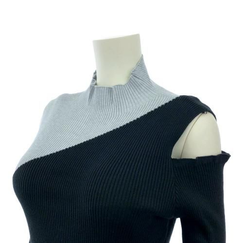 バイカラーオープンショルダーニットワンピース(キャバドレス・CABARETDRESS)。ブラックとグレーのモードなバイカラーに伸縮性のあるリブニットがボディにフィットし,女子らしい曲線が美しいワンピース。ハイネックがエレガントながらオープンショルダーから覗く素肌がヘルシーなデザインでヘビロテ間違えなし♪