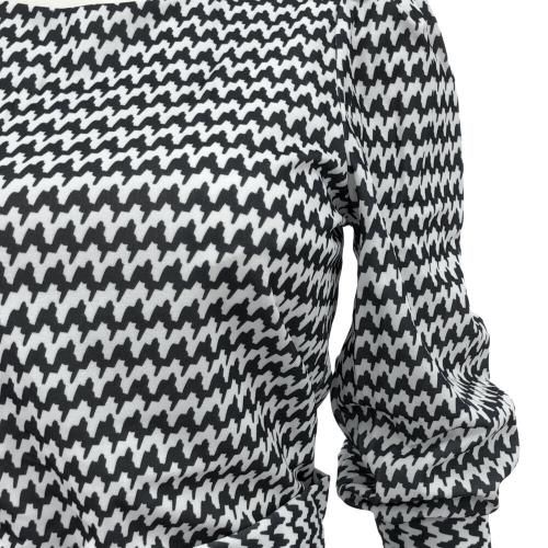 千鳥柄ディープカフスセットアップ(キャバドレス・CABARETDRESS)。千鳥格子フィッシュテールが歩くたびに揺れ、女性らしいフェミニンなマーメイド肩にボリュームを加えさらにディープカフスが華やかな印象に。
