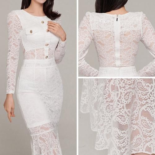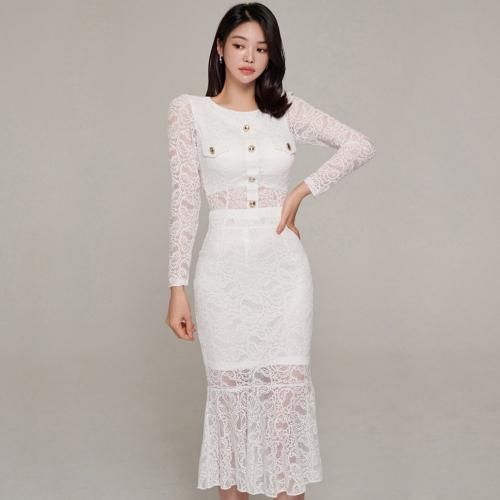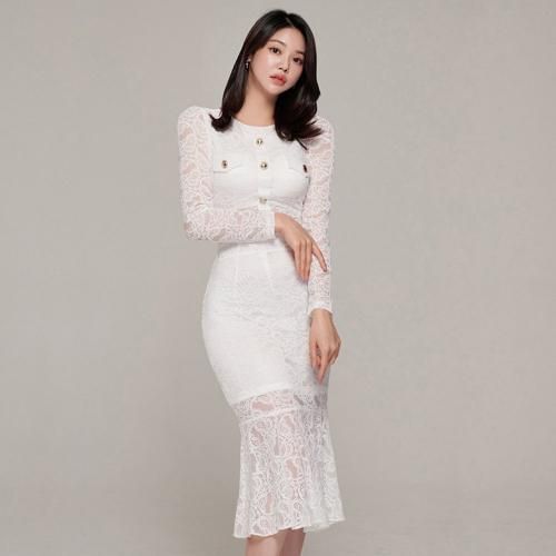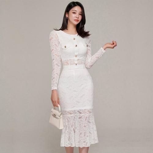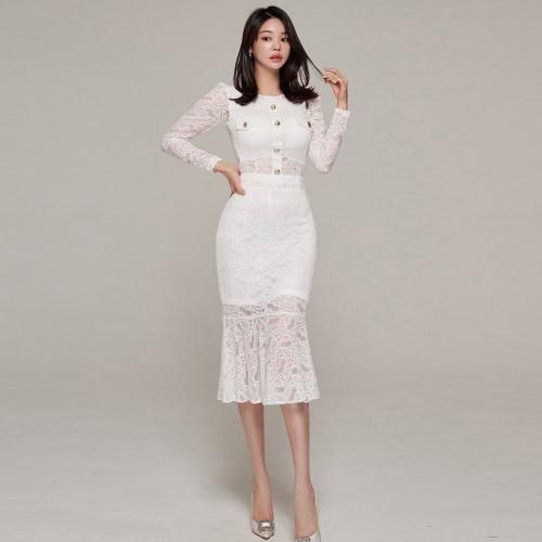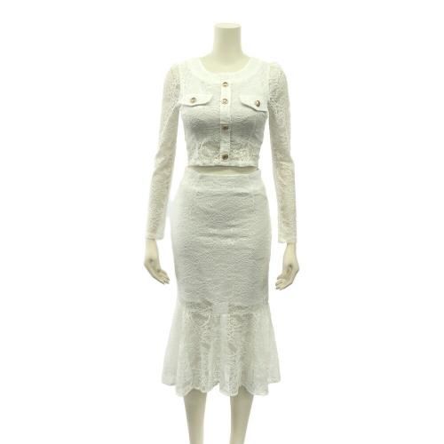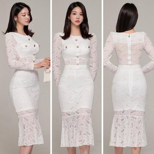 マーメイドラインレイヤードセットアップ(キャバドレス・CABARETDRESS)。オールレースにゴールドフェイクボタンが目を惹くクロップド丈の長袖トップスは、小ぶりのアクセサリーが映えるジュエルネックがエレガントにお顔周りをスッキリ見せ、カジュアルライクに仕上げたフェイクポケットがアイキャッチになりスタイルアップ。マーメイドラインのスカートは女性らしい曲線が引き立ち、レイヤードのシアー感がすっきり抜け感を演出してくれます♪