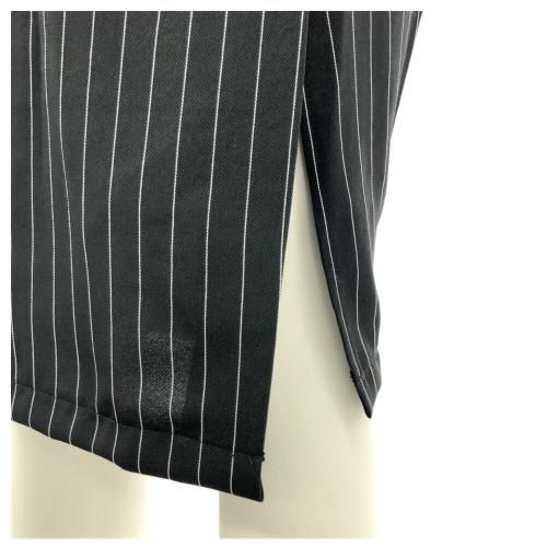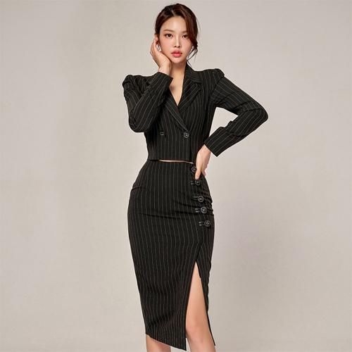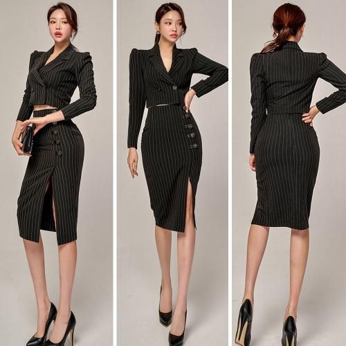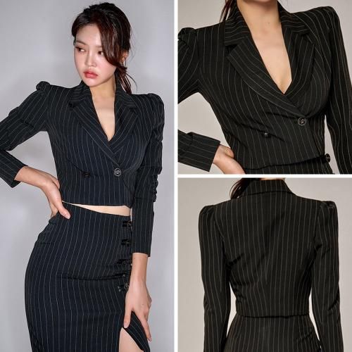 ショート丈ジャケットピンストライプセットアップ(キャバドレス・CABARETDRESS)。ピンストライプにダブルボタンがシャープで、ショート丈ジャケットにハイウエストスカートがウエスト位置を高く魅せることで脚長スタイルアップ効果も。クールな印象の肩パットが型崩れを防ぎ、深めに入ったサイドスリットの程良い肌魅せがセクシーなデザイン。インナーで印象が変わるので個性を出しつつ、ナイトワークやパーティで活躍するセットアップです。