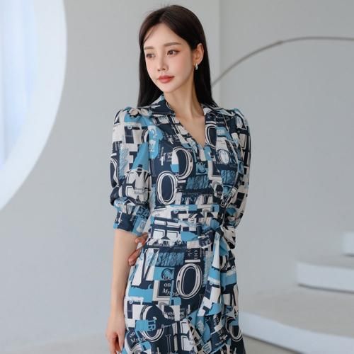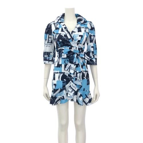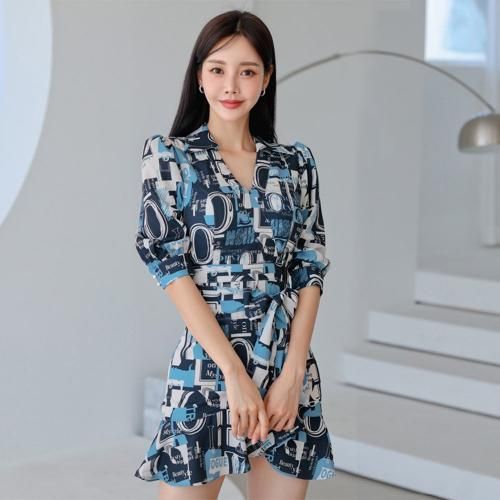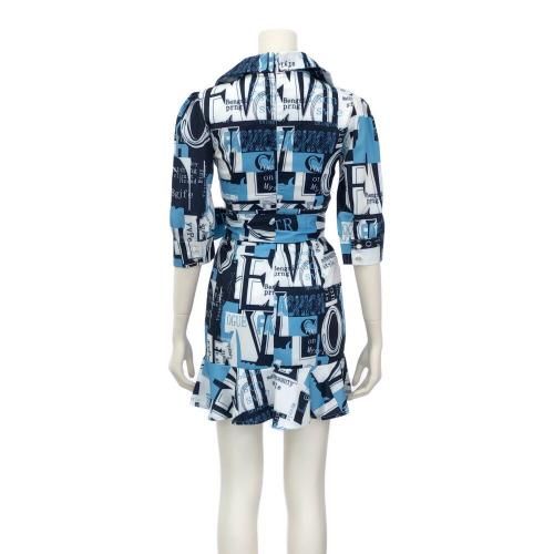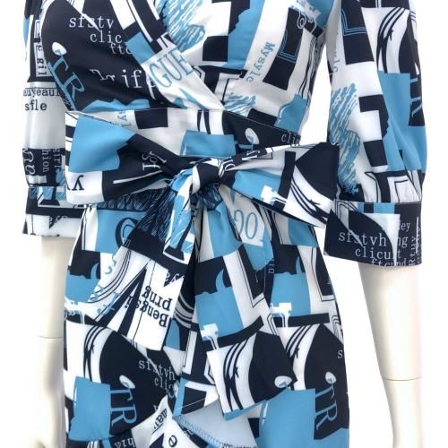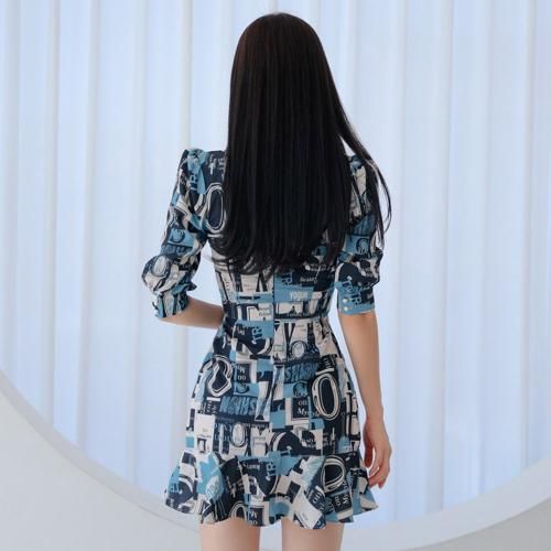 襟付き英字総柄フリルミニワンピース(キャバドレス・CABARETDRESS)。Vネックや五分袖などヘルシーな肌魅せに、フリルが揺れるレトロな英字プリントミニ丈ワンピース。ウエストマークのリボンで視線を上に集めることでスタイルアップに期待♪モダンなデザインが個性溢れる1着です。