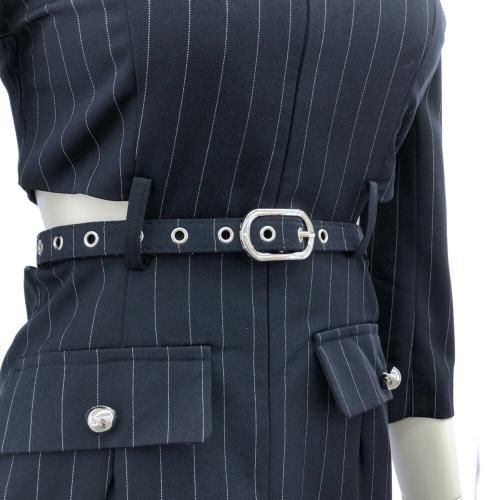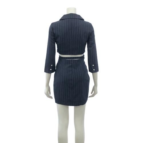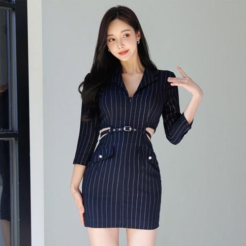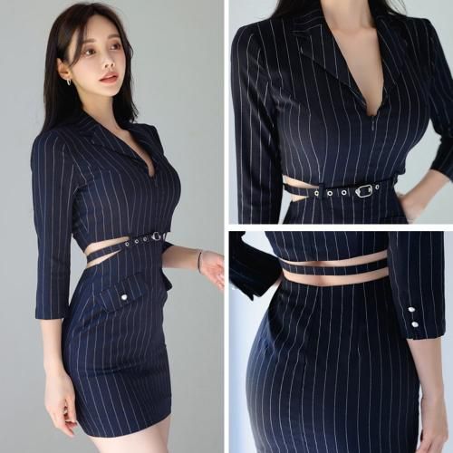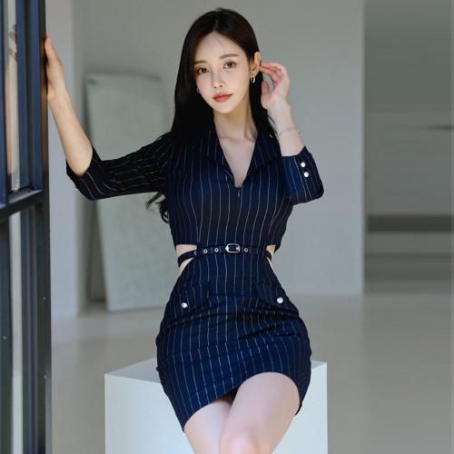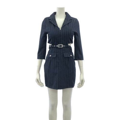 ピンストライプオープンバックミニワンピース(キャバドレス・CABARETDRESS)。ピンストライプにラペルカラーがクールなデザインワンピは、セクシーなVネックが女性らしいデザイン。フロントジップで着脱しやすく、ウエストマークのベルトに大胆なオープンバックスタイルで、ウエストラインがヘルシーに細見え♪また、七分袖がすっきり抜け感があり、ロングシーズン着用いただけます。