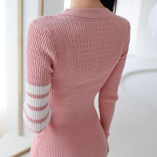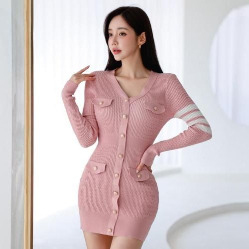 透かし編みニットVネックワンピース(キャバドレス・CABARETDRESS)。Vネックがデコルテやお顔周りをスッキリ見せ、ゴールドのフェイクボタンが縦のラインをすっきり美しく魅せてくれます。また、腕の白いラインやフェイクポケットのデザインがカジュアルな雰囲気。透かし編みニットがヘルシーな肌魅せで抜け感があり、お持ちのインナーキャミを合わせてスタイリングが完成。ウエストはリブの切り替えがシャープに魅せてくれます♪