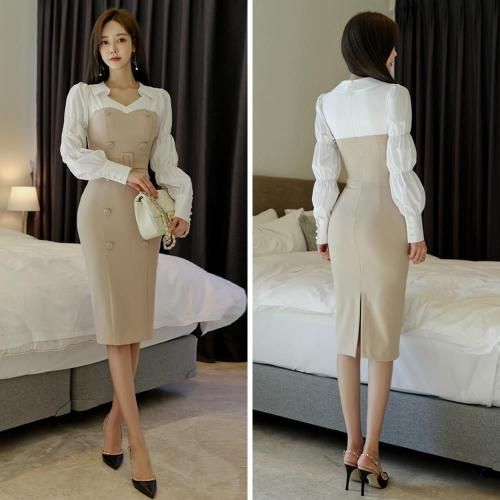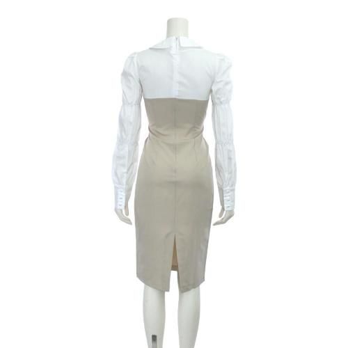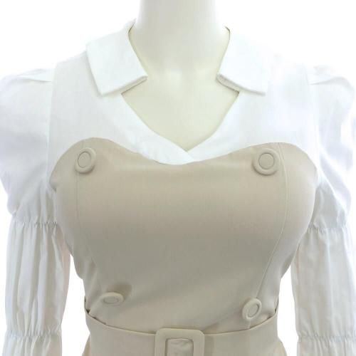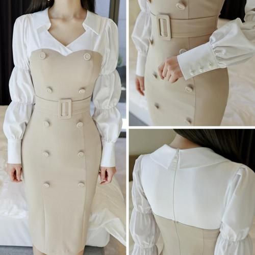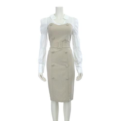 マムルークスリーブシャツドッキングワンピース(キャバドレス・CABARETDRESS)。ふんわりボリュームあるマムルークスリーブと、シャツドッキングデザインが目を惹くワンピース。フロントは抜け感があるスキッパーネックに、飾りベルトとダブルボタンのスタイリッシュなトレンチ風デザイン。袖にはフェミニンなパール風のボタンがアクセント♪バックスタイルはスリットが入ったシンプルデザインで、幅広い年代の方に着用いただけます。