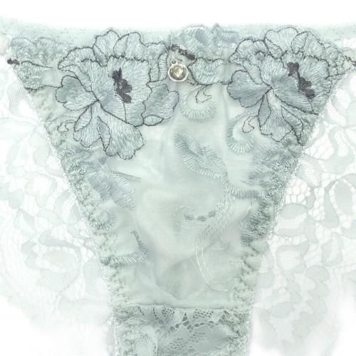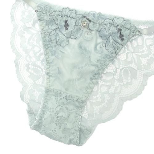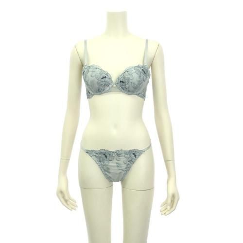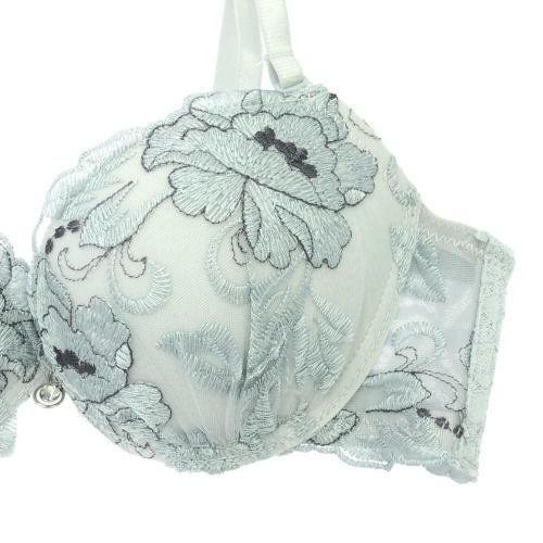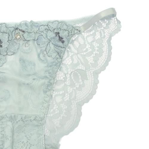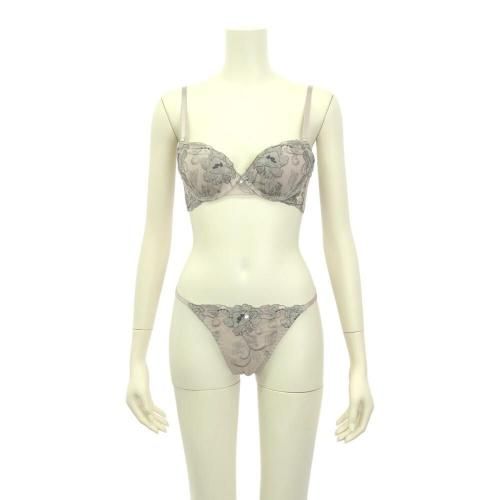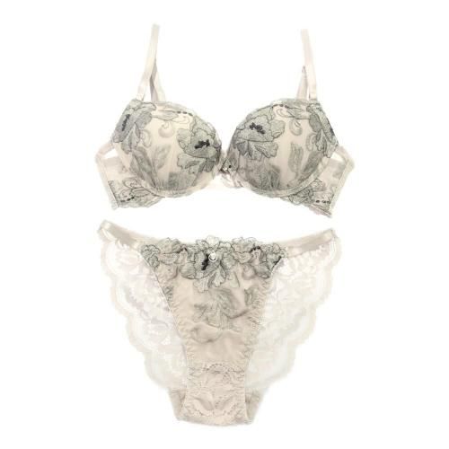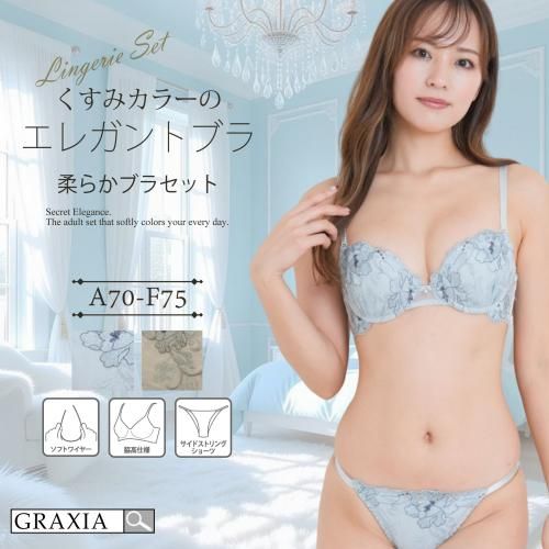 くすみカラーのアンティーク感に心和らぐブラ・ショーツセット(ブラセット)。花柄刺しゅうがエレガントに肌になじむくすみカラー。柔らかワイヤーで優しく胸を支え、脇高サイドボーンが背中に流れるお肉をキャッチ。また、パット内蔵で自然にボリュームアップ。ショーツはサイドストリングに、素肌が透ける人気のバックレースでセクシーな華やかさをアピール。