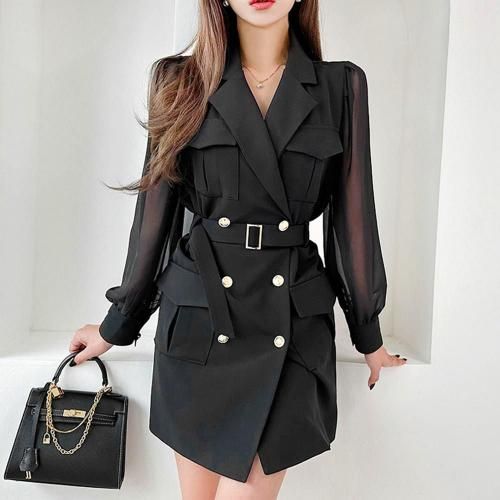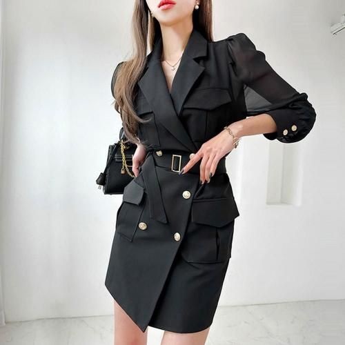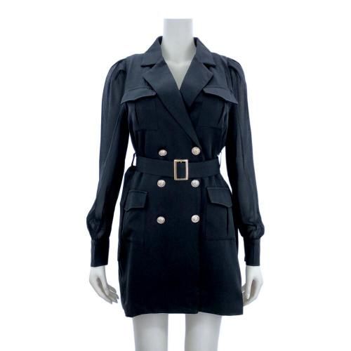 ミリタリーカーゴジャケットワンピース(キャバドレス・CABARETDRESS)。テーラードにカーゴポケットが印象的なワンピースは、シアースリーブでカジュアルな中にも抜け感と甘さをプラス。深めのVネックなので、インナーにキャミワンピを合わせることで、胸元の露出を防ぎつつもオシャレな着こなしに♪無地だからこそコーデの幅が広がり、ベルトをハイウエストで巻けばスタイルアップにも。
