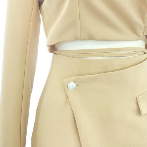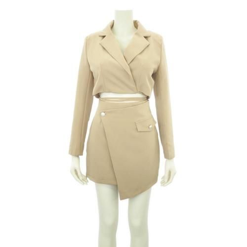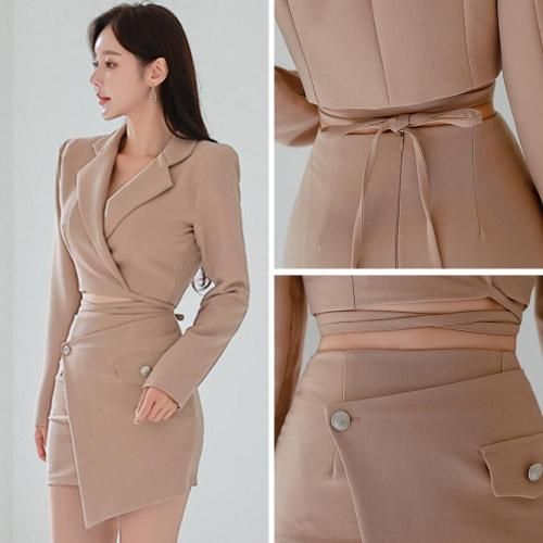 クロップド丈ロングクロスストリングセットアップ(キャバドレス・CABARETDRESS)。クロップドジャケットは長めのストリングをウエストにクロスさせることで表情が変わり、肩パット入りで型崩れを防ぎよりシャープなデザイン。アシンメトリーのラップ風ミニスカートは長めの裾が縦のラインを作りすっきりとした印象でスタイルアップ♪インナーなしで素肌を見せても、キャミやハイネックを着用しても雰囲気が変わりコーデの幅を楽しめます。