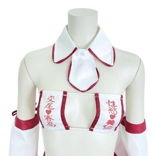 コミックの世界から抜け出して来たような大胆セクシーキュートな巫女風コスプレ(COSPLAY)。大胆なアレンジを加えた巫女装束に眼帯ブラジャーを組み合わせた男の子のロマンがぎゅっと詰まったえちえちコスチュームセット。巫女装束を彷彿とさせる、くくり紐デザインの小袖口カバーに緋袴風ミニスカートや掛襟を模した付け襟など、見た目は和装でありながら簡単に着付けられる洋風デフォルメが嬉しい仕様。メッセージの描かれた眼帯ブラに前垂れをイメージした捲れたら一発アウトな布切れふんどしショーツ等々、どこを取ってもセクシー要素満載でこれなら煩悩ごと一発昇天間違いなし!一度は夢見た穢れることのない神聖な巫女さんのあられもない姿を拝めちゃうおすすめのアイテム♪