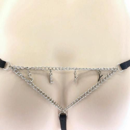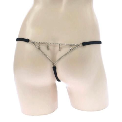 SEXYチャーム付きTバック・ショーツ(T-BACK・SHORTS)。シンプルなフロントデザインとは相反して、腰に揺れるSEXYの文字チャームと、Gストリングのチェーンが色っぽい。Gストリングがヒップに食い込み、より官能的なショーツ。
