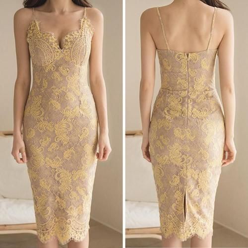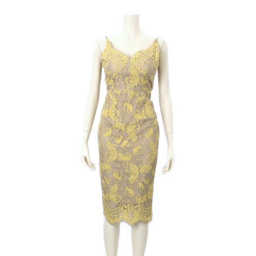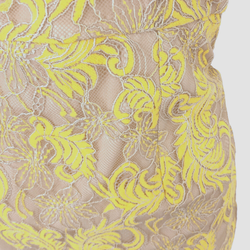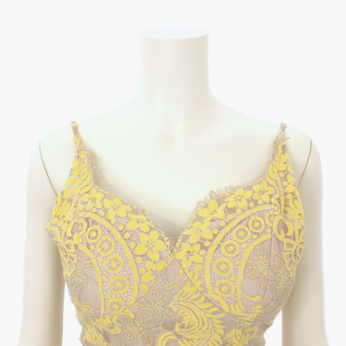タイトラインイエローキャミワンピース(キャバドレス・CABARETDRESS)。落ち着いたベージュのベースにイエローレースがミモザのように鮮やかで、アイラッシュレースがさらに華やかさをプラス。スウィートハートネックが胸元をセクシーに、立体的な縫製がボディラインを美しく魅せてくれます。シックの中にも可憐なデザインが光り、ONもOFFもオススメのデザイン♪
