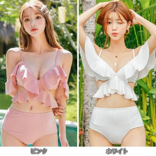 クロスフリルハイウエストビキニ2点セット(水着・ビーチウェア)。オフショルにフリルがマシュマロのようなフェミニンデザイン。クロスやハイウエストショーツでウエスト周りをカバーし、厚みにあるワイヤー入りパットがメリハリあるセクシーボディを叶えます♪