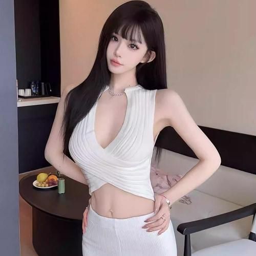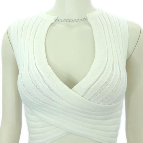 クロスニットタンクトップス(TOPS)。首元にシルバーチェーンを渡し、フロントから覗く素肌が大胆でセクシーなクロスデザイン。ウエスト位置を高く魅せるクロップド丈に伸縮性のあるリブニットが女性らしいボディラインを強調。また、ハイウエストボトムスとの相性も良いので、足を長くトップをコンパクトに魅せることでスタイルアップ♪セクシーの中にもシャープさを感じるトップスです。