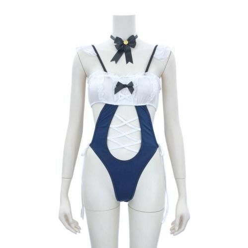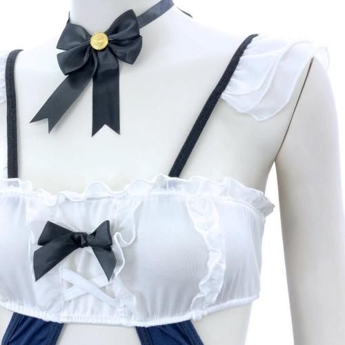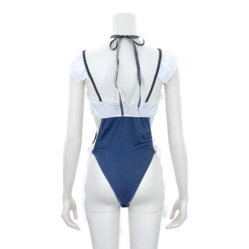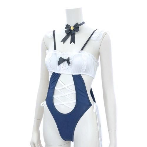 スポーティとフェミニンを掛け合わせた猫耳スク水メイド風コスプレ(COSPLAY)。ボディラインを強調した紺色のハイレグがスク水を彷彿とさせ、トップにあしらった可愛らしいフリルとリボンがメイド風の良いとこ取りセクシーテディ。バストを強調したチューブトップデザインに、レースアップから覗く素肌がドキッとさせるウエスト。そして腰まで伸びる超ハイレグは、はみ出そうなくらいギリギリライン。クロッチ部分はスナップボタンで開閉可能なのであっという間に露わな姿に♪サイドストリングを解くことで更に際どい肌魅せに興奮度が高まります。猫耳、スク水やメイドなどフェティシズムを刺激する要素をたっぷり詰め込んだコスプレです。