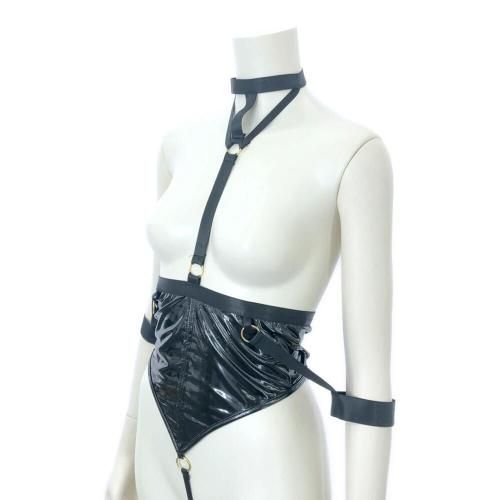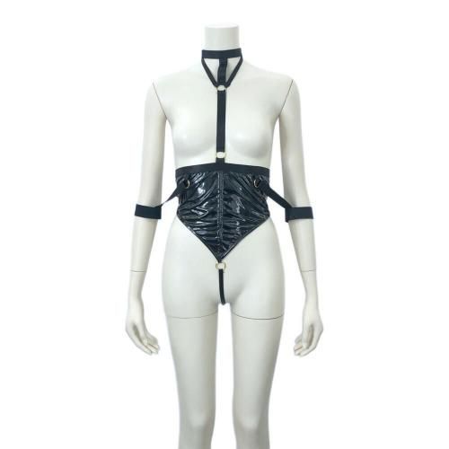 露わになったバストにエナメルの光沢が熱い時間を期待させるボンテージ風テディ(TEDDY)。首からボンテージに伸びるラインが素肌をシャープに渡る。ボンテージをウエストのみ身に着けることでスタイルアップし、露わになったバストに、より視線が集まる刺激的なデザインに。また、ボンテージ一体になった手枷に腕を通すことで自由を制限され、さらに拘束感と興奮度がアップ♪クロッチ部分は華奢なストリングが肉体に食い込み、丸みあるヒップを惜しげもなく露出します。