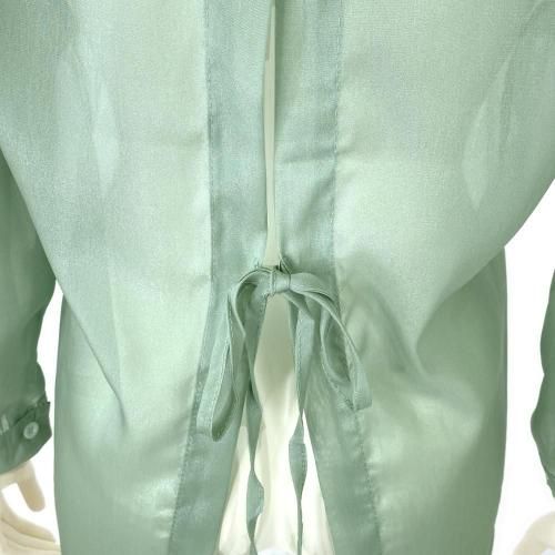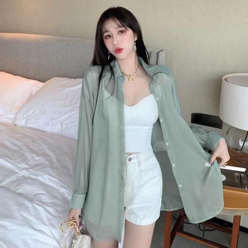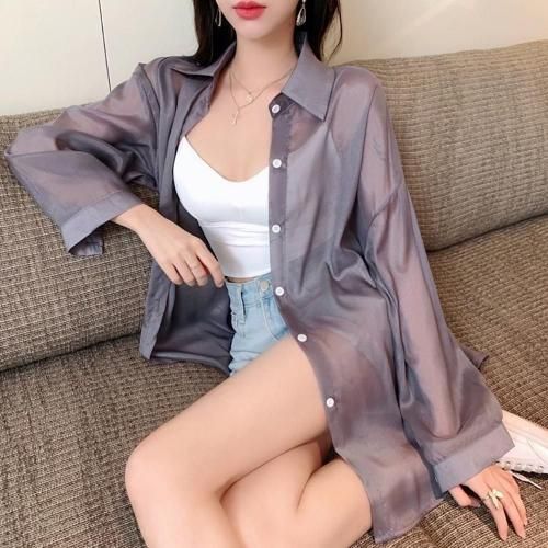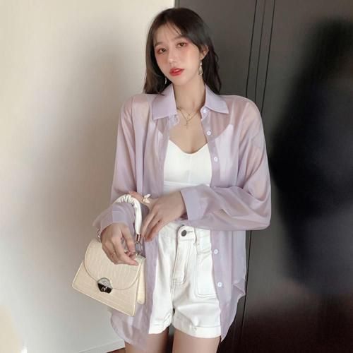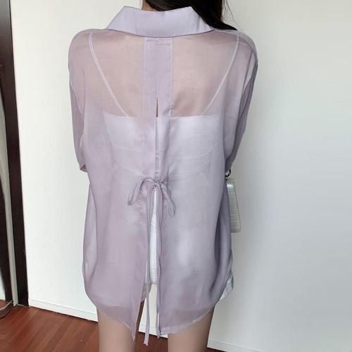 バックスリットシアーシャツトップス(TOPS)。微かな光沢感、軽やかなシアー素材にバックスリットが抜け感のあるデザインシャツ。ヒップまで隠れるロング丈で、バックスリットにはリボンのワンポイントが大人フェミニンムード漂います♪シアーの透け感がインナーを惹き立たせ、ゆったりシルエットが着心地良くスタイルアップ効果を発揮。アウターのようにさっと羽織りやすいのでロングシーズン着用いただけます。