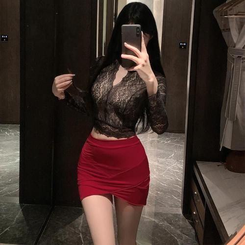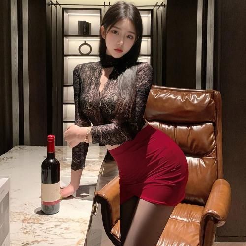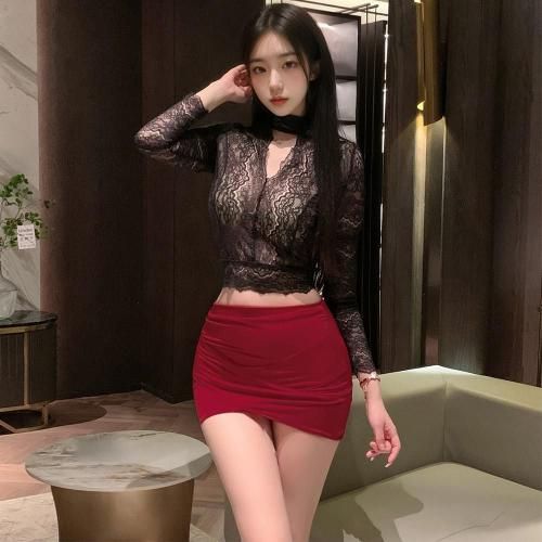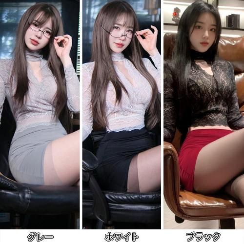 誰も知らない知的な彼女のサプライズ秘書風コスプレ(COSPLAY)。ピタピタなシルエットがボディラインをくっきり強調したセットアップ。トップスは胸元のカットアウトから谷間が露出したレース素材に、バックスタイルは素肌がスケスケなメッシュ素材でそれぞれ異なる透け感が楽しめます。フロントが短くなったミニスカートは、ヒップの丸みを感じるとてもタイトな作りで腰つきに目がくらみそう♪そして、タイトミニがゆえに足を組み代えるたびオープンクロッチのストッキングが露出する、理性がぶっ飛ぶこと間違えなしのサプライズ!知的な雰囲気とは程遠い甘ーい秘書の誘惑につい負けてしまいそう。