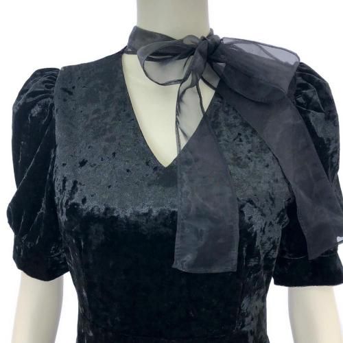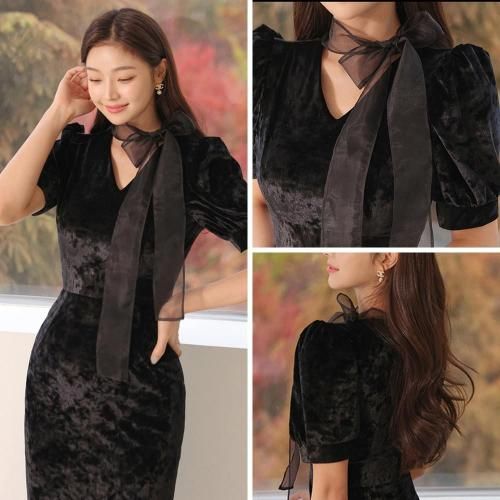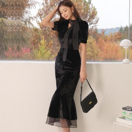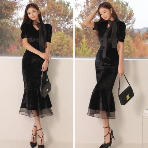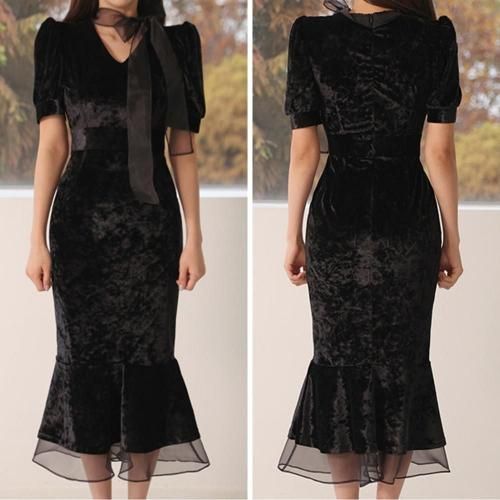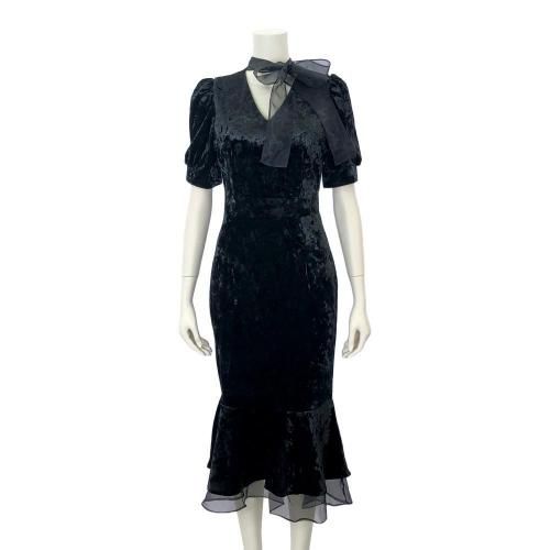 ベロアマーメイドラインドレッシーワンピース(キャバドレス・CABARETDRESS)。ベロア調の光沢にエアリー感のあるリボンのアクセントがお顔周りを華やかにし、女性らしいシルエットのマーメイドラインが目を惹くデザイン。裾から覗くオーガンジーやクラシカルなパワーショルダーにより、ブラックでも重くならずに軽やかな印象に。ハイウエストで脚長効果もあり、七分袖が手首をすっきり見せることでスタイルアップにも期待♪パーティやお仕事、特別な日に着用したいドレッシーな一着です。