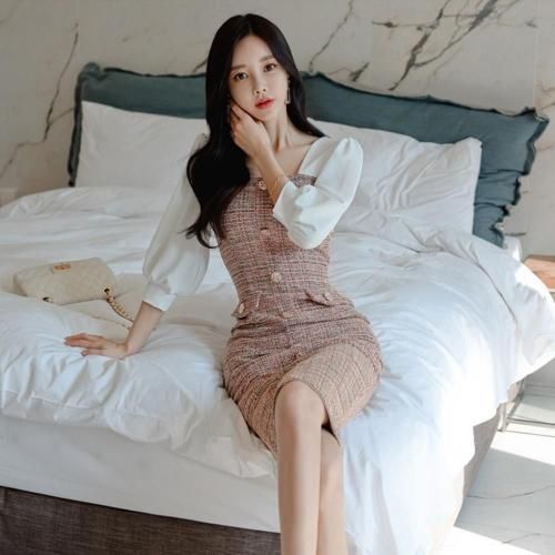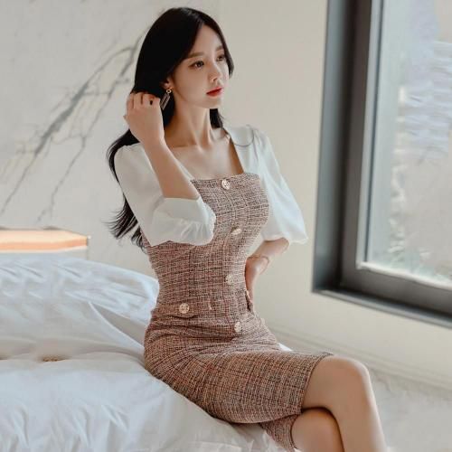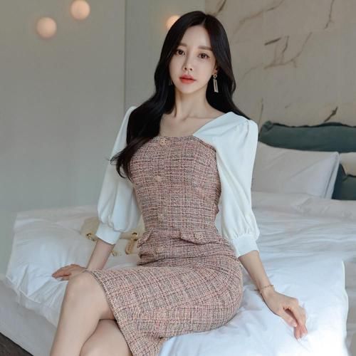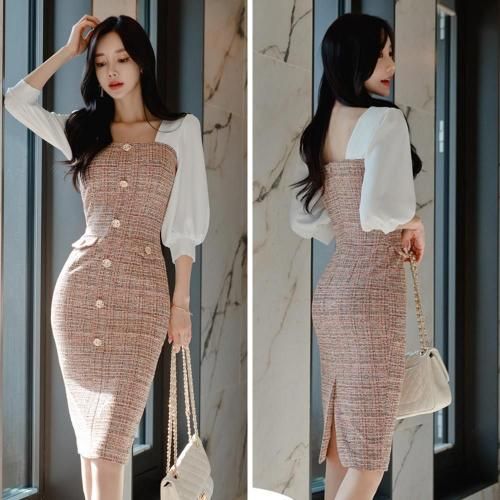 ドッキングツイードワンピース(キャバドレス・CABARETDRESS)。ツイード生地の風合い豊かな暖かみのあるカラーに、ミディ丈にタイトシルエットが大人エレガントなワンピ。抜け感のある七分袖や、スクエアネックがスッキリシャープに魅せてくれます。伸縮性があり動きやすく、ゴールドボタンのアクセントが縦のラインを作ることでスタイルアップ効果も発揮。お仕事もプライベートも自信に溢れるデザインです♪
