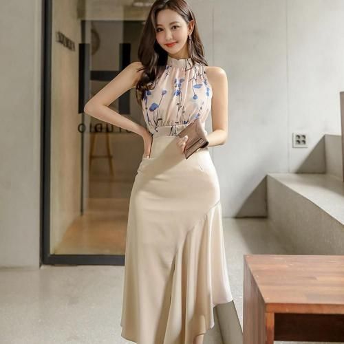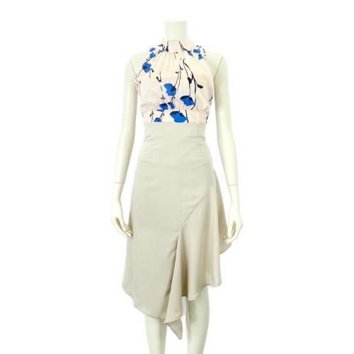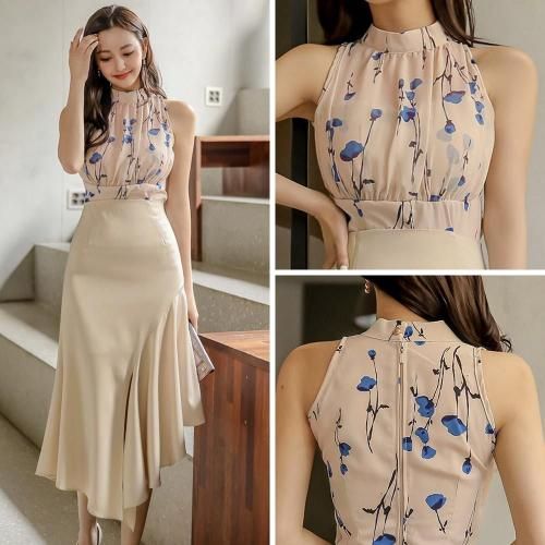 フラワーアメスリカットソー×アシメスリットスカートセットアップ(キャバドレス・CABARETDRESS)。ピンクベージュの柔らかな色合いにブルーのフラワーラインが上品なアメスリカットソーは、肩を華奢に魅せ、ハイウエスト切り替えが単品として着用時にもスタイルアップを発揮。また、落ち着いたベージュカラーがシックなミディ丈スカートはドレープが軽やかなアシメデザインで、スリットは女性らしいセンシュアルな深めスリット。それぞれシングルユースでも使いやすいセットです♪