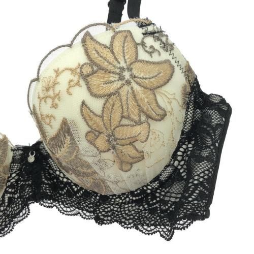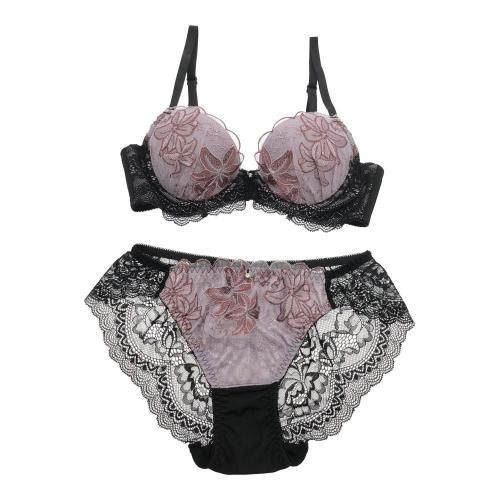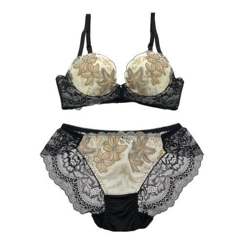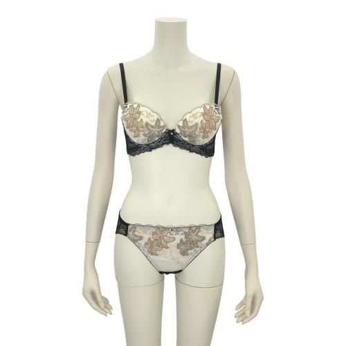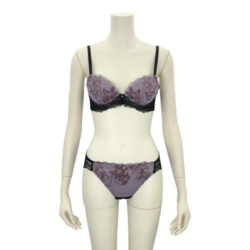 ナチュラルに美しくバストメイクするブラ・ショーツセット(ブラセット)。くすみカラーが百合の刺しゅうが落ち着きあるデザイン。すっきりと安定感のあるU字バックと脇高仕様でお肉を背中に逃がしにくくし、寄せずに盛らない自然なバストラインなのにキレイをキープします。人気のバック総レースショーツは食い込みにくく、ストレッチ素材でヒップを優しく包み込んでくれます。