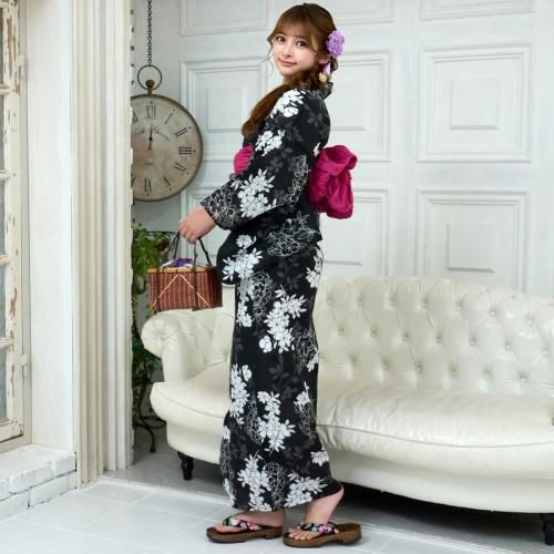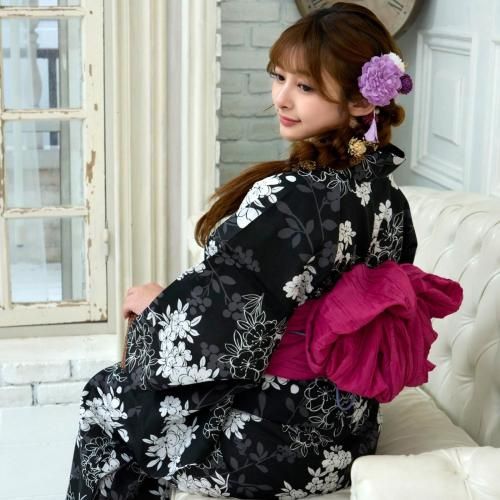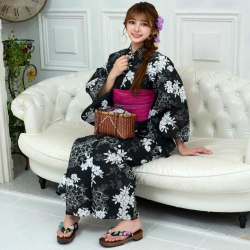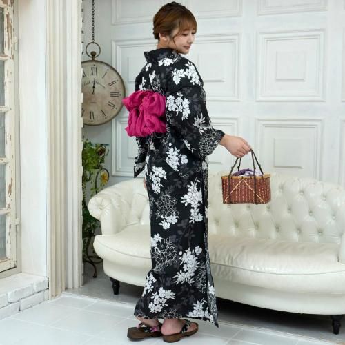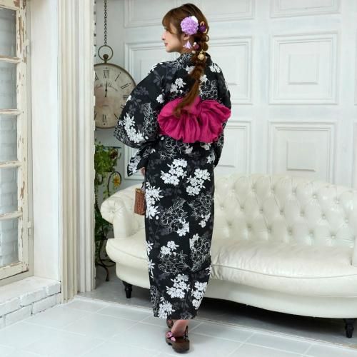 黒地に白の梅の花が優雅に配置されたモノクローム浴衣3点セット(YUKATA)