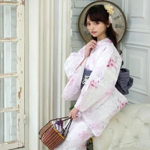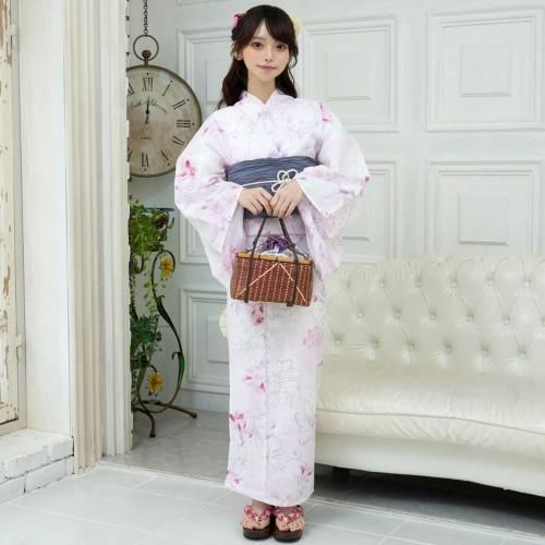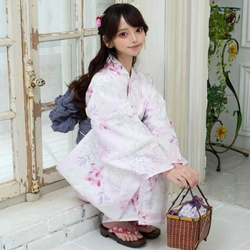 白地にピンクの線描と水彩調の花々が舞う浴衣3点セット(YUKATA)。