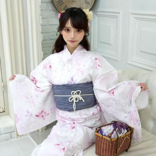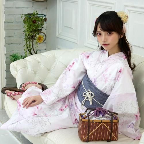 白地にピンクの線描と水彩調の花々が舞う浴衣3点セット(YUKATA)
