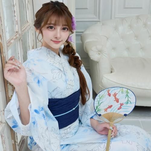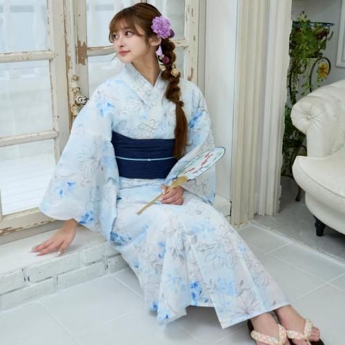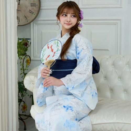白地に淡いブルーの線描と水彩調の花々が舞う浴衣3点セット(YUKATA)