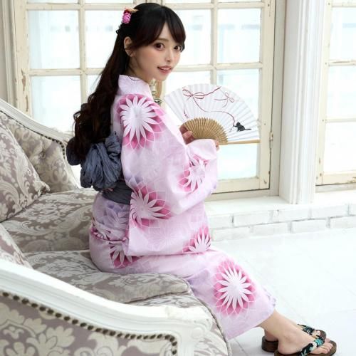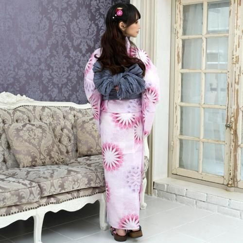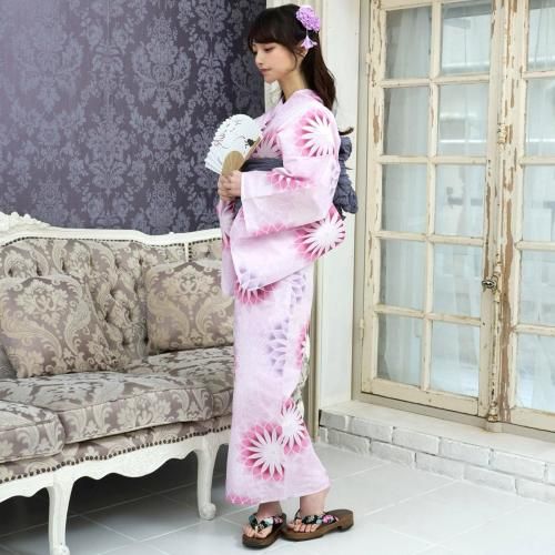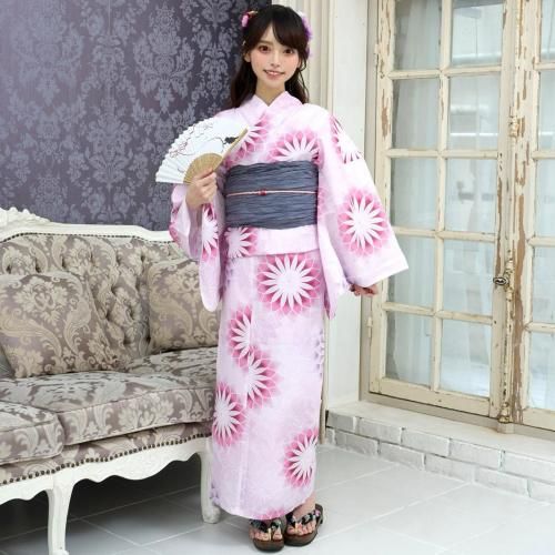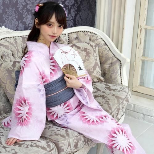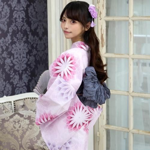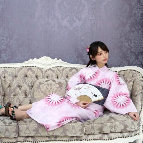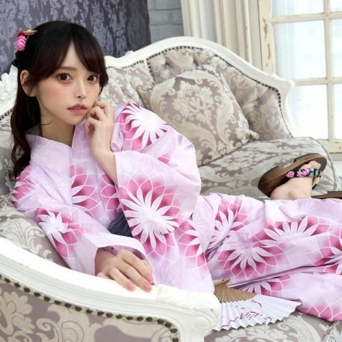 華やかなピンクの幾何学花模様の浴衣3点セット(YUKATA)