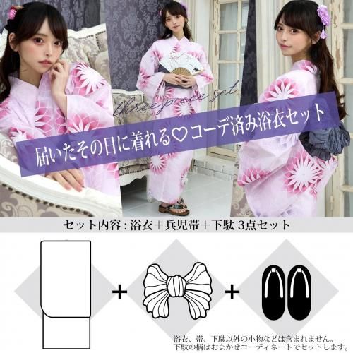 華やかなピンクの幾何学花模様の浴衣3点セット(YUKATA)。