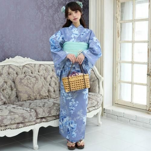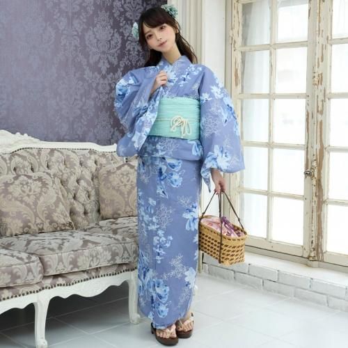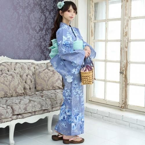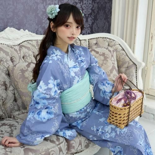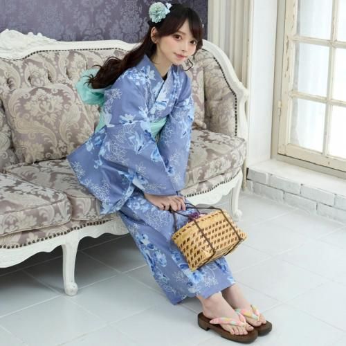 ブルーグレーに水彩画のような青い花々が描かれた浴衣3点セット(YUKATA)。