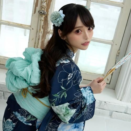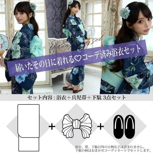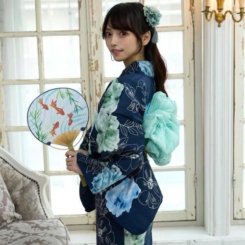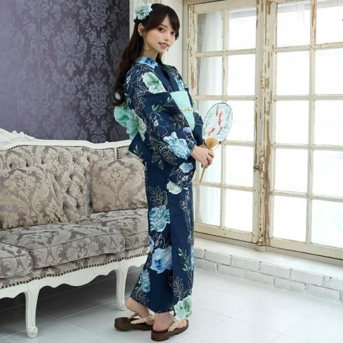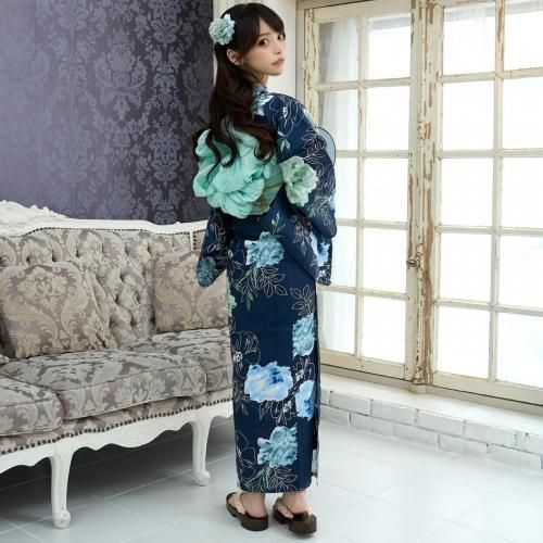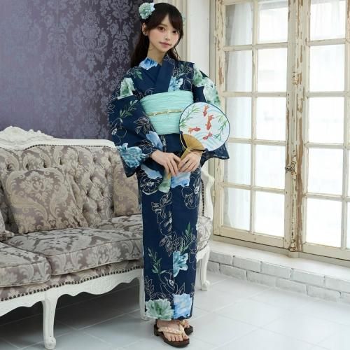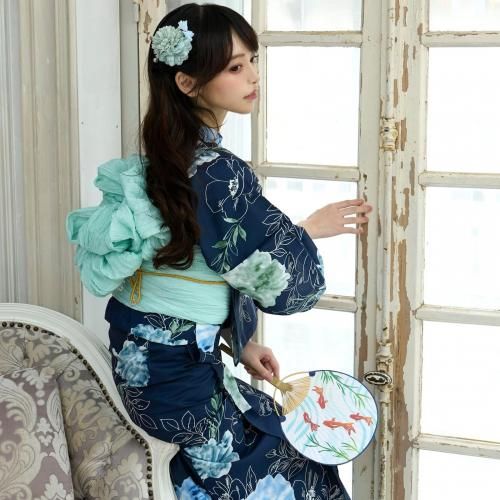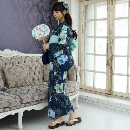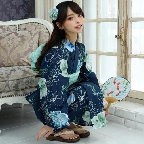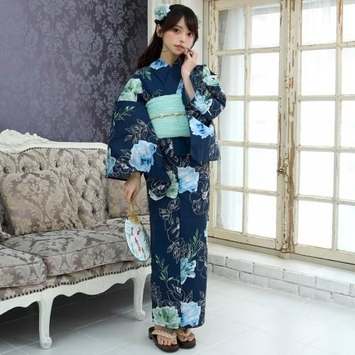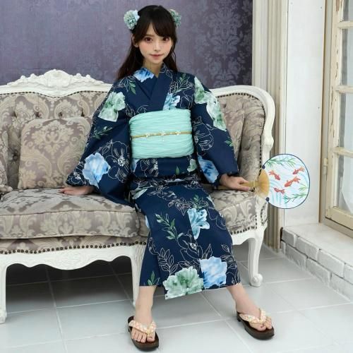 ネイビーにクラシカルな淡いグリーン系花柄浴衣3点セット(YUKATA)。
