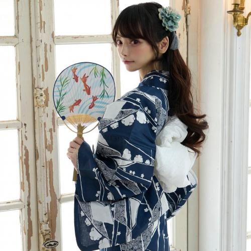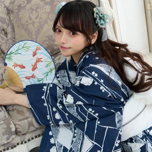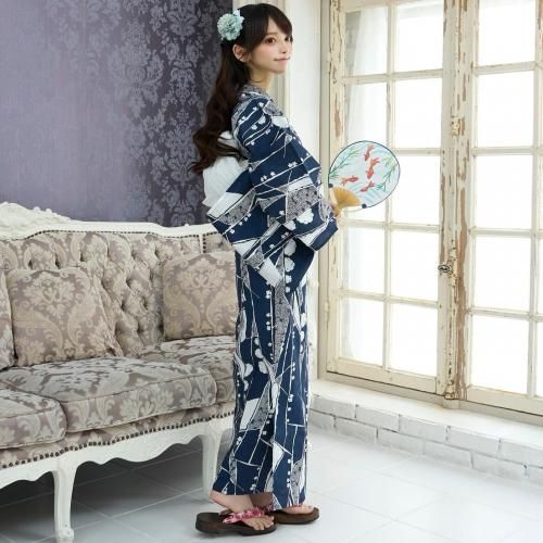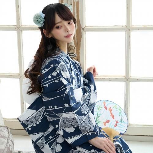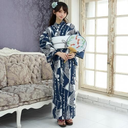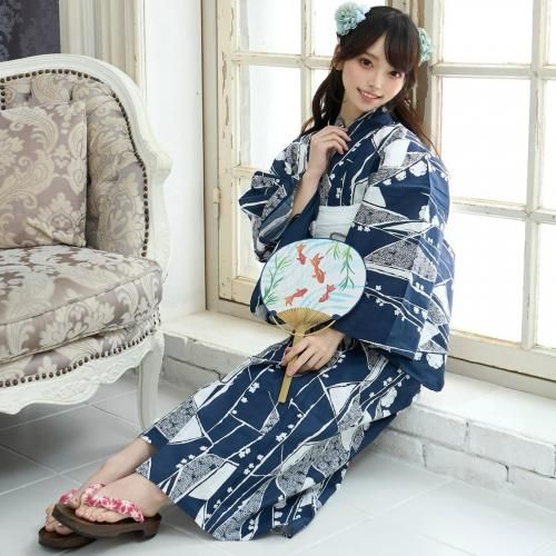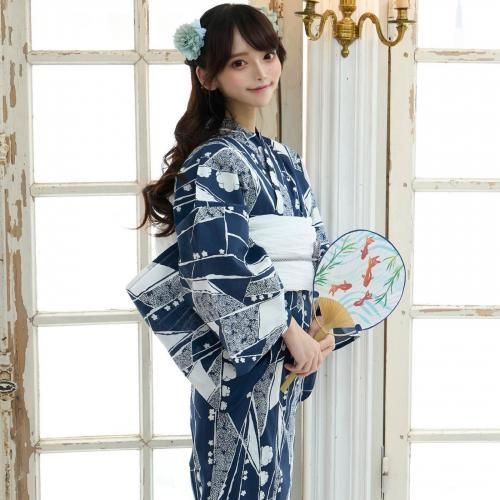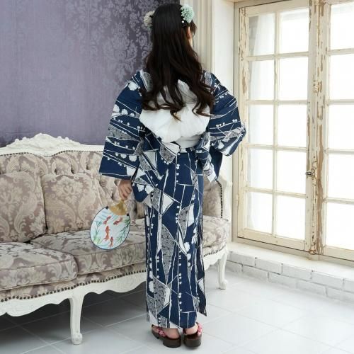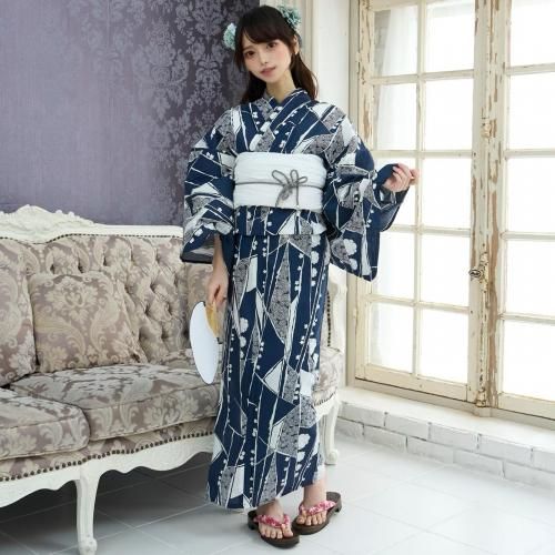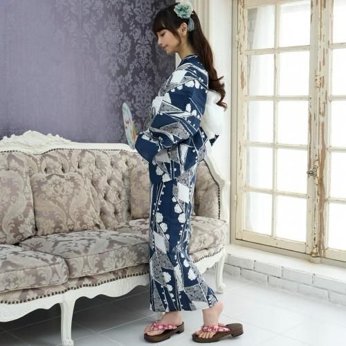 濃紺に白の幾何学文様浴衣3点セット(YUKATA)。