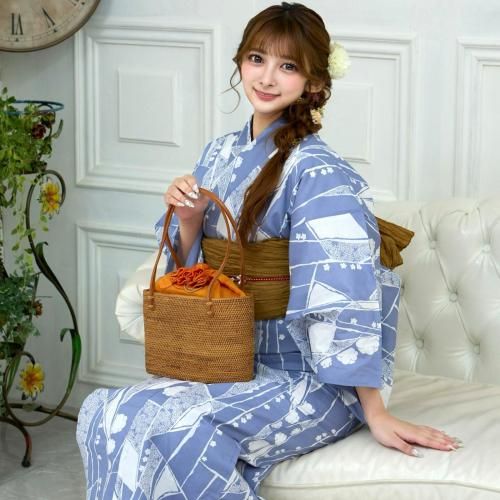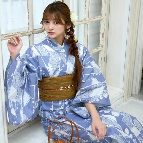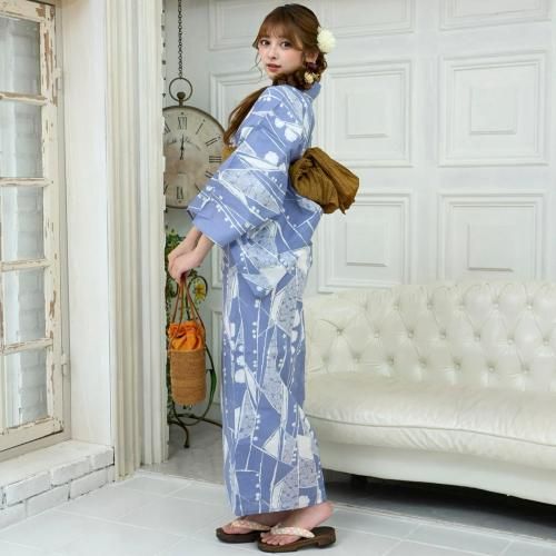 ブルーグレーに白の幾何学文様浴衣3点セット(YUKATA)
