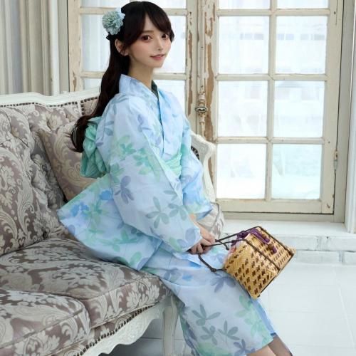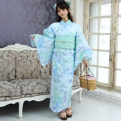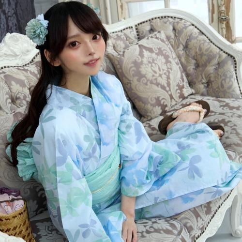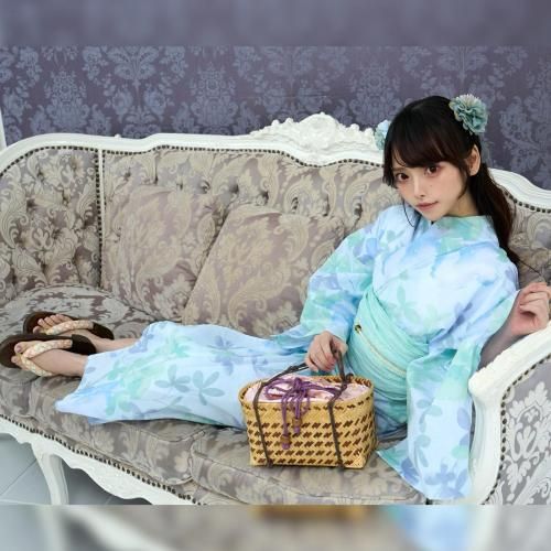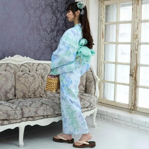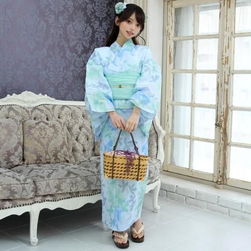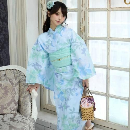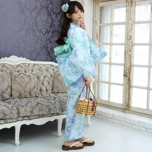 薄水色地にブルーとグリーンの抽象花模様の浴衣3点セット(YUKATA)