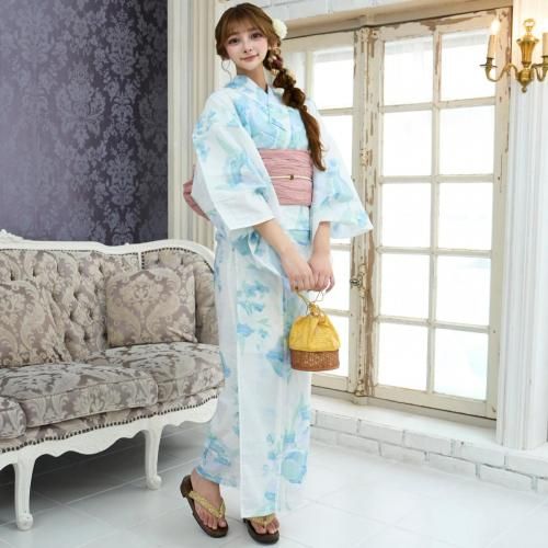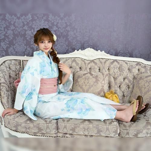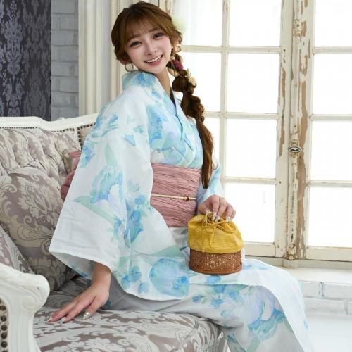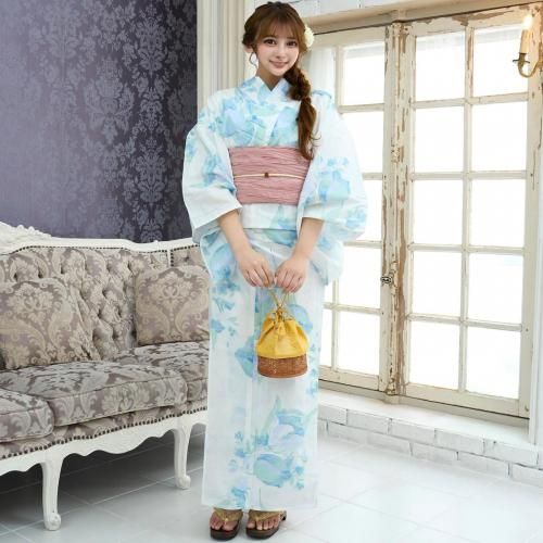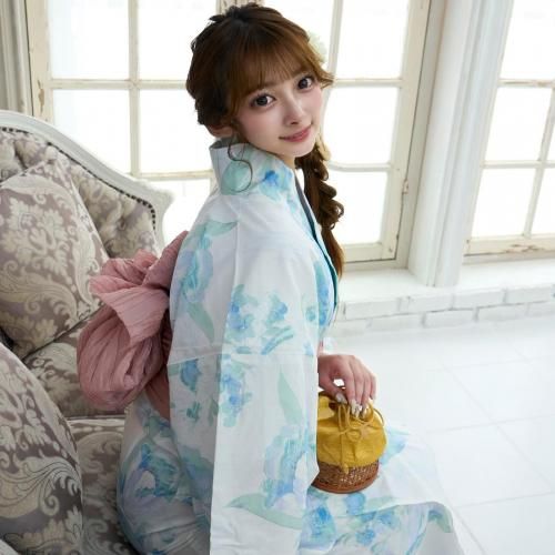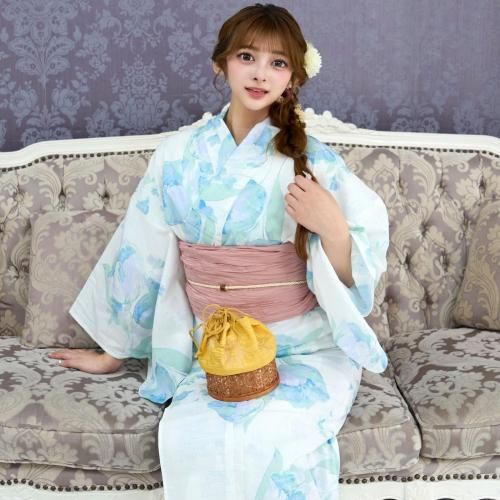 白地に涼やかなブルーとグリーンのチューリップがふんわりと描かれた浴衣3点セット(YUKATA)